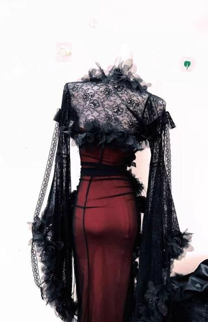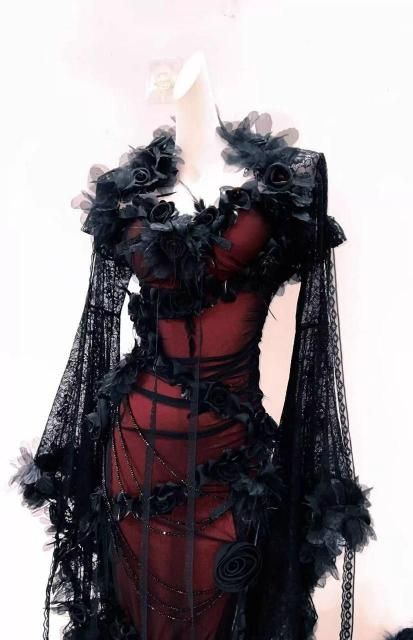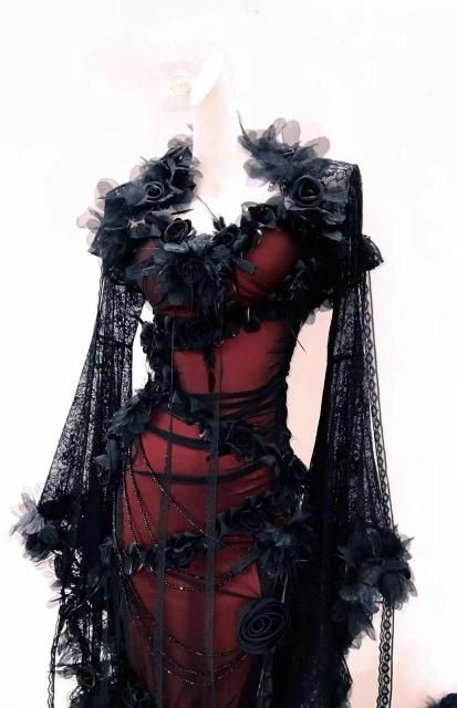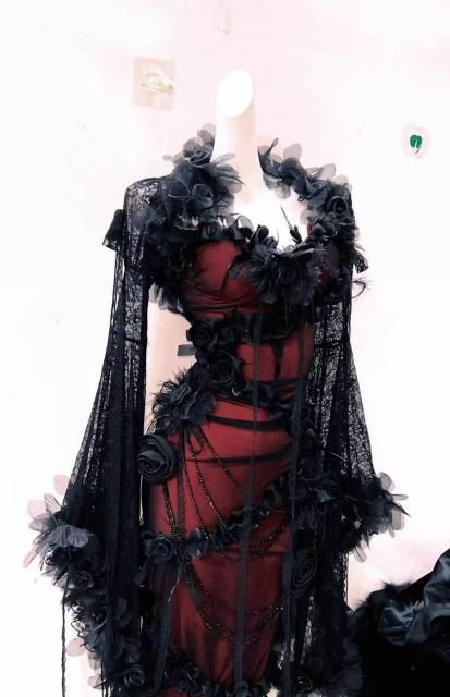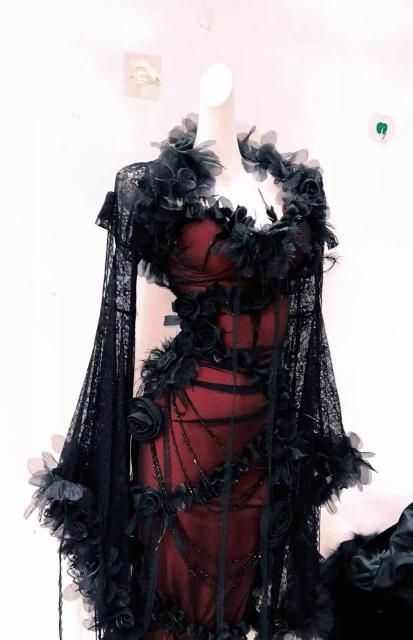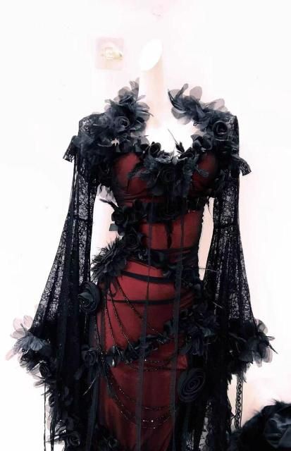 ダークスタイルの宮廷ドレス、ゴシックスタイルのバラの装飾が施されたドレス、羽根の襟とビーズのメッシュドレス コスプレ 衣装 通販 オーダーメイド